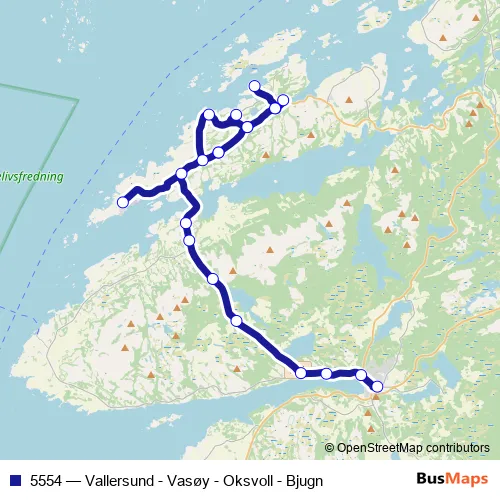 The first stop of the 5554 bus route is Vallersund oppvekstsenter and the last stop is Botngård. 5554 (Vallersund - Vasøy - Oksvoll - Bjugn) is operational during på hverdager.