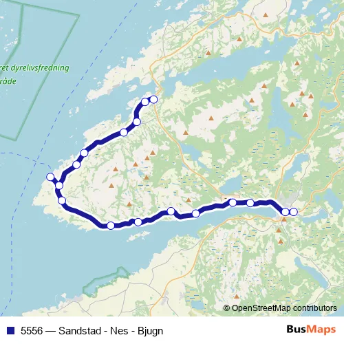 The first stop of the 5556 bus route is Botngård skole/Fosen vgs. and the last stop is Oksvoll skole. 5556 (Sandstad - Nes - Bjugn) is operational during på hverdager.