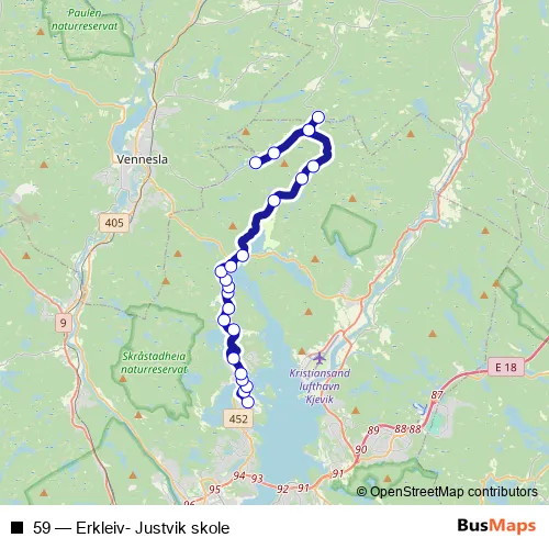 The first stop of the 59 bus route is Havliveien and the last stop is Granetjønn. 59 (Erkleiv- Justvik skole) is operational during på hverdager.