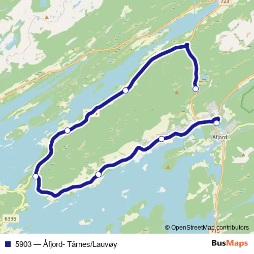 The first stop of the 5903 bus route is Åset skole and the last stop is Skola. 5903 (Åfjord- Tårnes/Lauvøy) is operational during på hverdager.