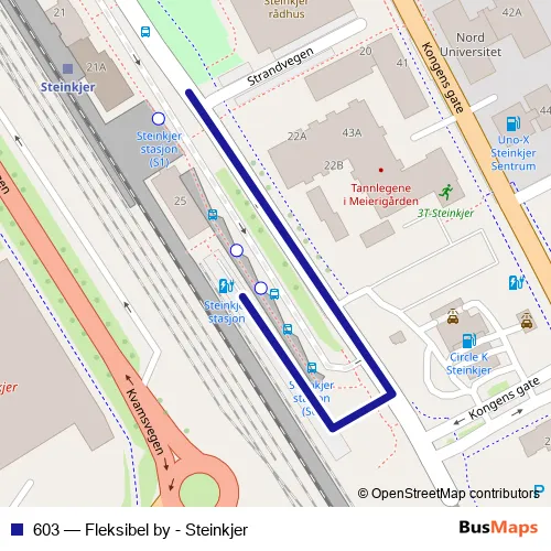 The first stop of the 603 bus route is Steinkjer stasjon and the last stop is Steinkjer stasjon. 603 (Fleksibel by - Steinkjer) is operational during hver dag.
