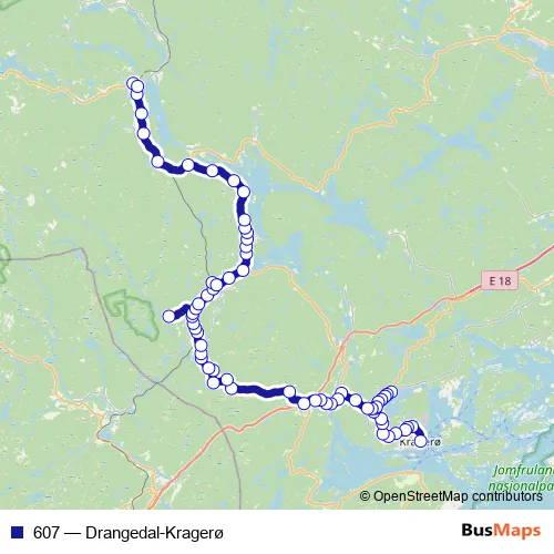 The first stop of the 607 bus route is Kragerø rutebilstasjon and the last stop is Drangedal stasjon. 607 (Drangedal-Kragerø) is operational during hver dag.