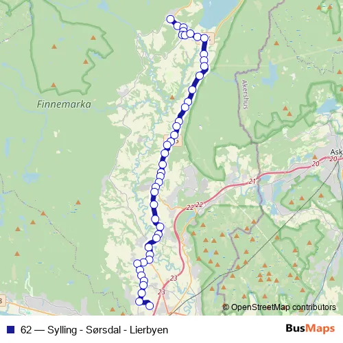 The first stop of the 62 bus route is Kyllerud and the last stop is Lier vgs.. 62 (Sylling - Sørsdal - Lierbyen) is operational during på hverdager.