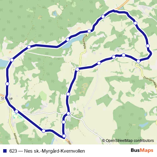 The first stop of the 623 bus route is Nes skole and the last stop is Nes skole. 623 (Nes sk.-Myrgård-Kvernvollen) is operational during hver dag.