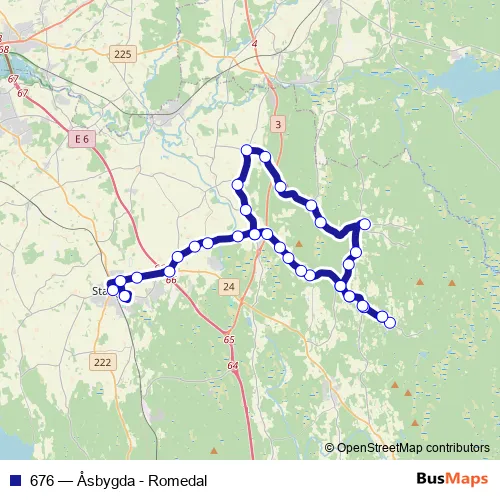 The first stop of the 676 bus route is Stange skysstasjon and the last stop is Romedal. 676 (Åsbygda - Romedal) is operational during på hverdager.