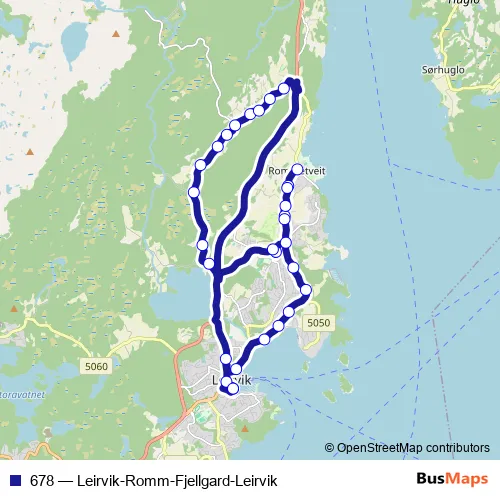 The first stop of the 678 bus route is Leirvik terminal and the last stop is Leirvik terminal. 678 (Leirvik-Romm-Fjellgard-Leirvik) is operational during på hverdager.