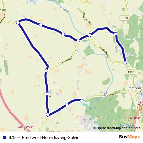 The first stop of the 679 bus route is Fredsvold and the last stop is Solvin skole. 679 (Fredsvold-Herredsvang-Solvin) is operational during på hverdager.