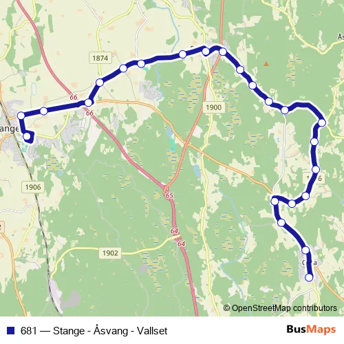 The first stop of the 681 bus route is Stange videregående skole and the last stop is Vallset skole. 681 (Stange - Åsvang - Vallset) is operational during på hverdager.