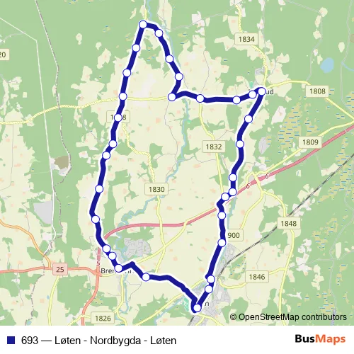The first stop of the 693 bus route is Løten stasjon and the last stop is Løten stasjon. 693 (Løten - Nordbygda - Løten) is operational during på hverdager.