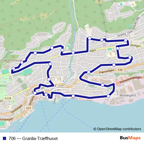 The first stop of the 706 bus route is Molde trafikkterminal and the last stop is Molde trafikkterminal. 706 (Granlia-Træffhuset) is operational during hver dag.