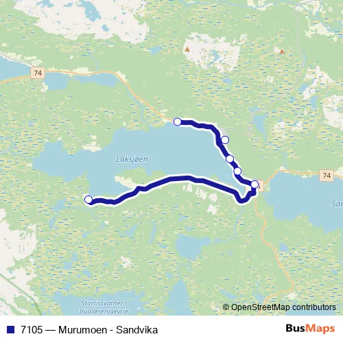 The first stop of the 7105 bus route is Ånes and the last stop is Stortangen skole. 7105 (Murumoen - Sandvika) is operational during på hverdager.