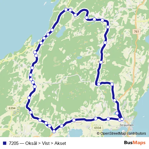 The first stop of the 7205 bus route is Akset and the last stop is Akset. 7205 (Oksål > Vist > Akset) is operational during på hverdager.