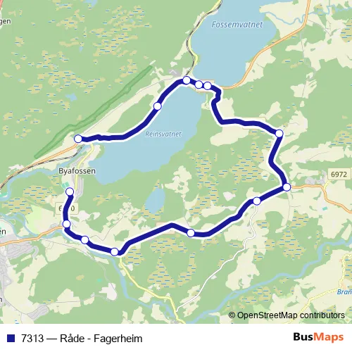 The first stop of the 7313 bus route is Byafossen skole and the last stop is Reinsvegen. 7313 (Råde - Fagerheim) is operational during på hverdager.