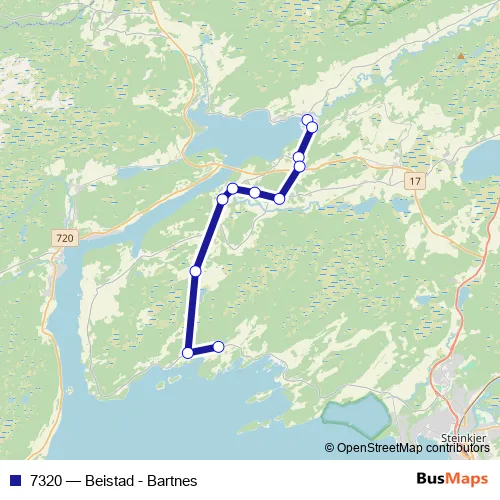 The first stop of the 7320 bus route is Beitstad skole and the last stop is Elnan. 7320 (Beistad - Bartnes) is operational during på hverdager.