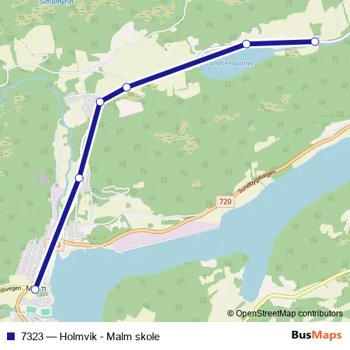 The first stop of the 7323 bus route is Landsem and the last stop is Malm skole. 7323 (Holmvik - Malm skole) is operational during på hverdager.