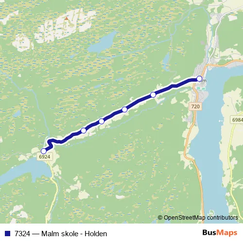 Services on the 7324 - Malm skole - Holden bus stop at 07:58 on mandag, tirsdag, onsdag, torsdag, fredag.
