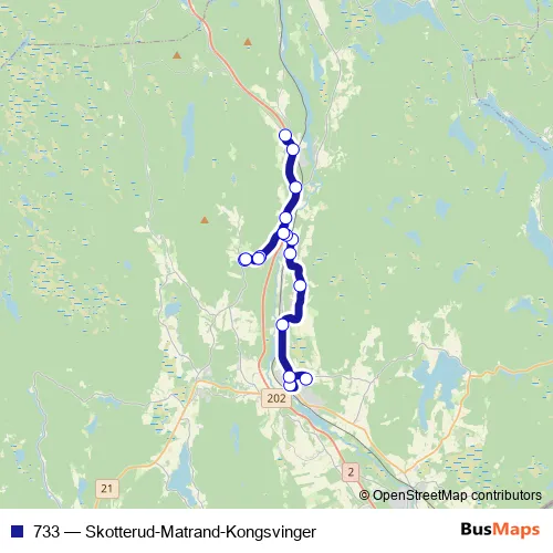 The first stop of the 733 bus route is Skotterud skole and the last stop is Skrådalsvegen. 733 (Skotterud-Matrand-Kongsvinger) is operational during på hverdager.