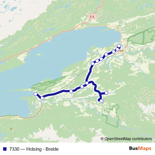 The first stop of the 7330 bus route is Snåsa skole and the last stop is Kjenstadberget. 7330 (Holsing - Breide) is operational during på hverdager.