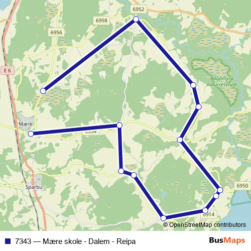 The first stop of the 7343 bus route is Ålbergsmyra and the last stop is Mære skole. 7343 (Mære skole - Dalem - Reipa) is operational during på hverdager.