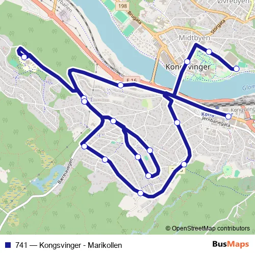 The first stop of the 741 bus route is Kongsvingerhallen and the last stop is Glommengata. 741 (Kongsvinger - Marikollen) is operational during på hverdager.