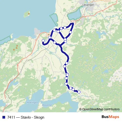 The first stop of the 7411 bus route is Skogn barne- og ungdomsskole and the last stop is Holåsen vest. 7411 (Stavlo - Skogn) is operational during på hverdager.