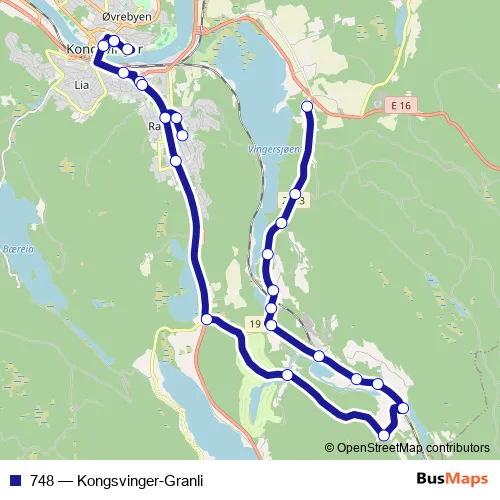 The first stop of the 748 bus route is Kongsvingerhallen and the last stop is Overud. 748 (Kongsvinger-Granli) is operational during på hverdager.