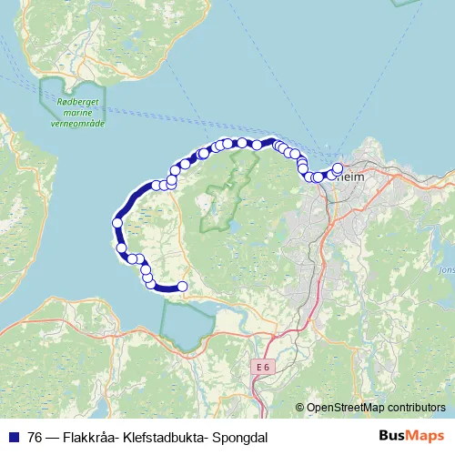 The first stop of the 76 bus route is Spongdal and the last stop is Flakkråa. 76 (Flakkråa- Klefstadbukta- Spongdal) is operational during hver dag.