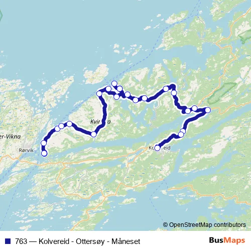 The first stop of the 763 bus route is Nærøysundet skole and the last stop is Kolvereid. 763 (Kolvereid - Ottersøy - Måneset) is operational during på hverdager.