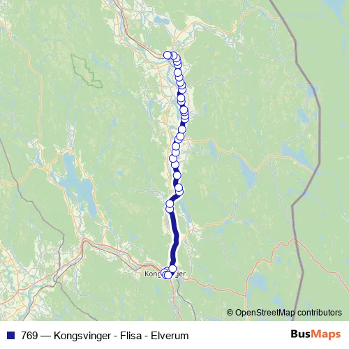 The first stop of the 769 bus route is Kirketorget and the last stop is Flisa busstasjon. 769 (Kongsvinger - Flisa - Elverum) is operational during på hverdager.