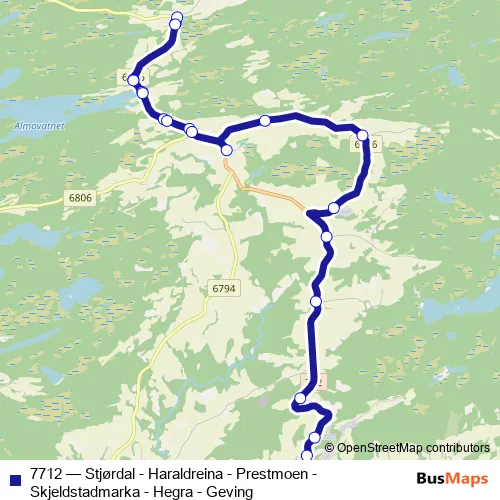Bus 7712 - Stjørdal - Haraldreina - Prestmoen - Skjeldstadmarka - Hegra - Geving in Stjordal: Stops & Timetable