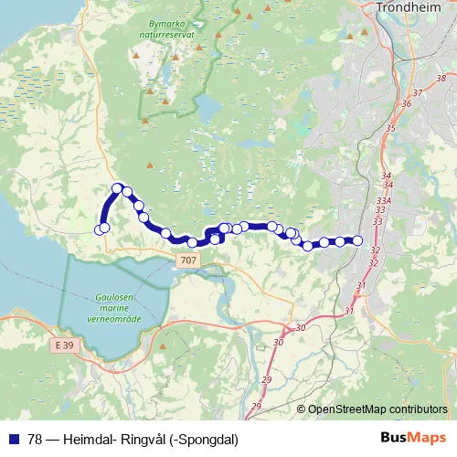 The first stop of the 78 bus route is Heimdal stasjon and the last stop is Ringvål. 78 (Heimdal- Ringvål (-Spongdal)) is operational during hver dag.