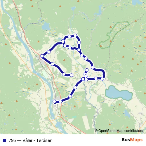 The first stop of the 795 bus route is Våler ungdomsskole and the last stop is Skjæret. 795 (Våler - Tøråsen) is operational during på hverdager.