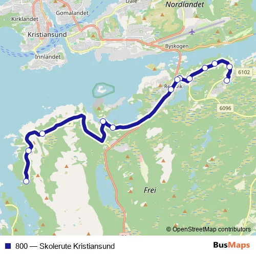 The first stop of the 800 bus route is Frei ungdomsskole and the last stop is Bjørnvik. 800 (Skolerute Kristiansund) is operational during på hverdager.