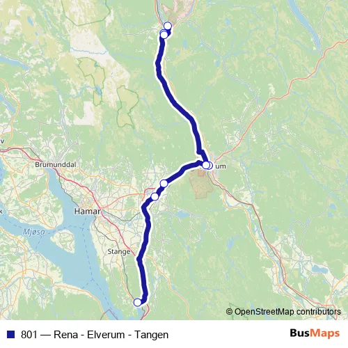 The first stop of the 801 bus route is Rena leir and the last stop is Tangen. 801 (Rena - Elverum - Tangen) is operational during hver dag.