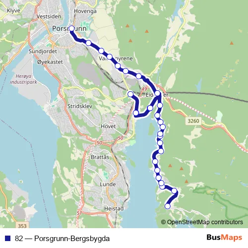 The first stop of the 82 bus route is Leerstang and the last stop is Porsgrunn Kammerherreløkka. 82 (Porsgrunn-Bergsbygda) is operational during på hverdager.