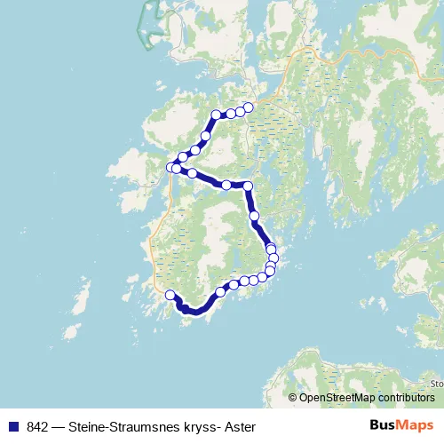 The first stop of the 842 bus route is Straume and the last stop is Straumsnes kryss. 842 (Steine-Straumsnes kryss- Aster) is operational during på hverdager.