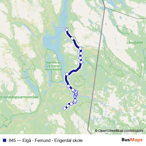The first stop of the 845 bus route is Engerdal skole and the last stop is Elgå. 845 (Elgå - Femund - Engerdal skole) is operational during på hverdager.