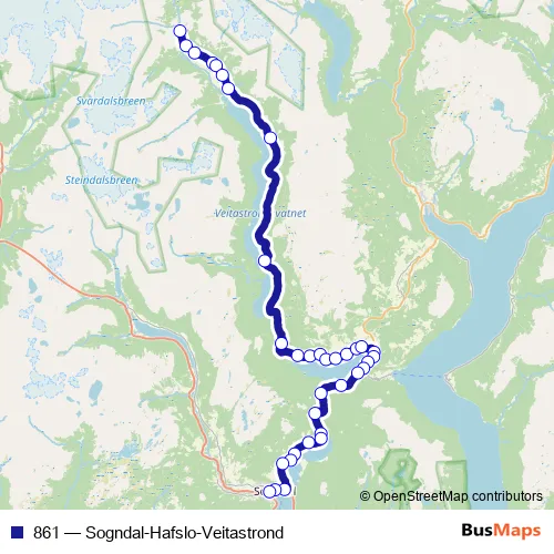 The first stop of the 861 bus route is Stølen and the last stop is Sogndal skysstasjon. 861 (Sogndal-Hafslo-Veitastrond) is operational during hver dag.