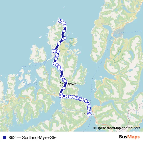 The first stop of the 862 bus route is Myre and the last stop is Stø. 862 (Sortland-Myre-Stø) is operational during hver dag.