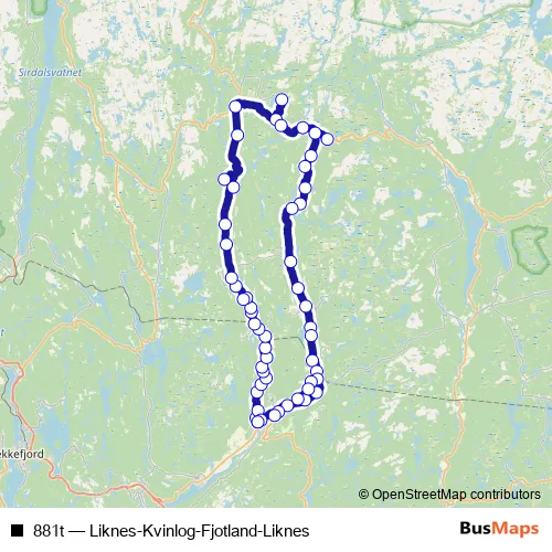 The first stop of the 881t bus route is Liknes and the last stop is Liknes. 881t (Liknes-Kvinlog-Fjotland-Liknes) is operational during hver dag.