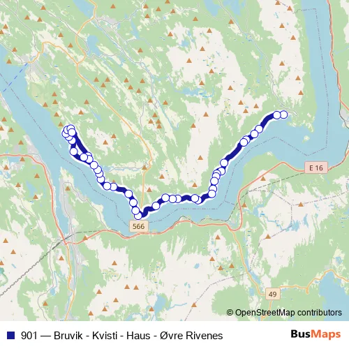 The first stop of the 901 bus route is Bruvik kyrkje and the last stop is Øvre Rivenes snuplass. 901 (Bruvik - Kvisti - Haus - Øvre Rivenes) is operational during hver dag.