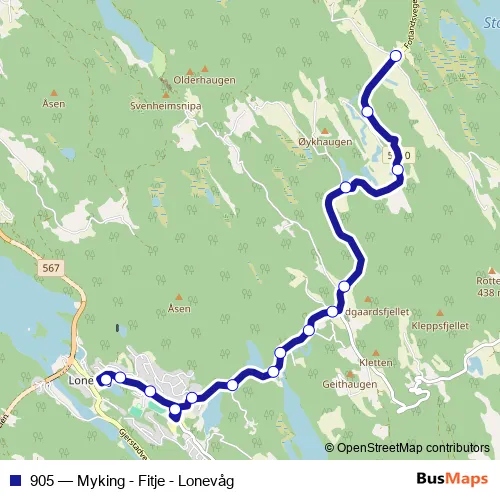 The first stop of the 905 bus route is Myking and the last stop is Lonevåg terminal. 905 (Myking - Fitje - Lonevåg) is operational during hver dag.