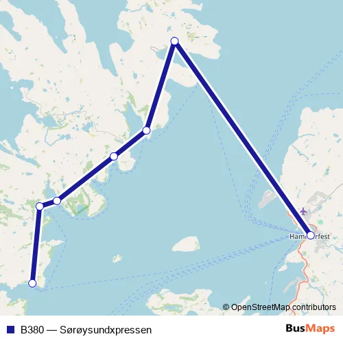 The first stop of the B380 ferry route is Hammerfest havn and the last stop is Akkarfjord kombibåtkai Sørøya. B380 (Sørøysundxpressen) is operational during hver dag.