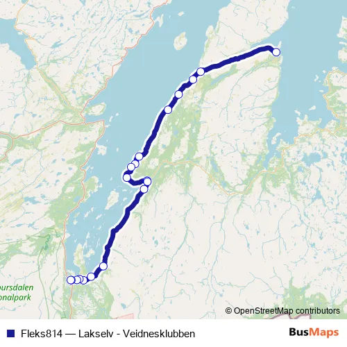 The first stop of the Fleks814 bus route is Veidnesklubben and the last stop is Lakselv Yx. Fleks814 (Lakselv - Veidnesklubben) is operational during hver dag.