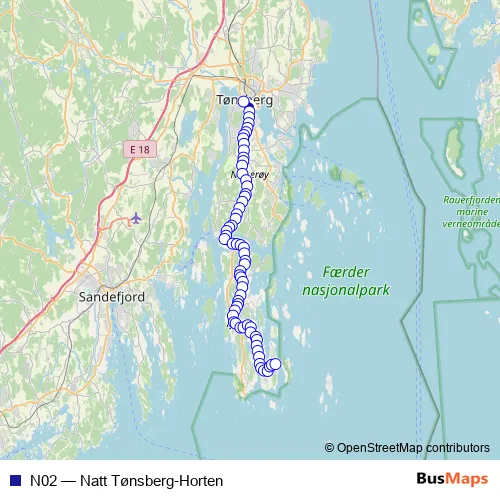 The first stop of the N02 bus route is Nedre Langgate and the last stop is Sandøsund. N02 (Natt Tønsberg-Horten) is operational during i helgene.