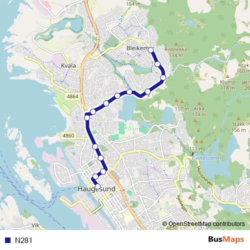 The first stop of the N281 bus route is Bleikemyr and the last stop is Sørhauggata/Torggata. N281 is operational during i helgene.