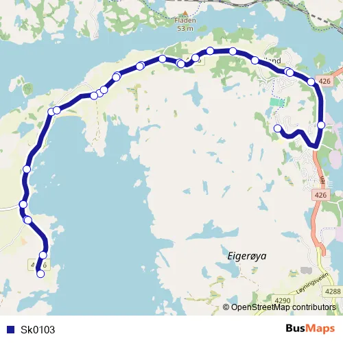 The first stop of the Sk0103 bus route is Eigerøy skole and the last stop is Leidlandsveien. Sk0103 is operational during på hverdager.