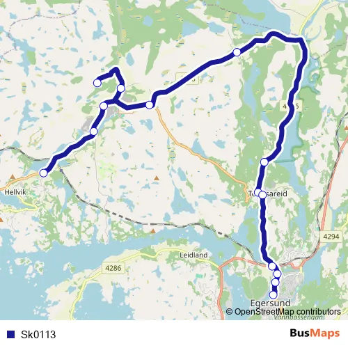 The first stop of the Sk0113 bus route is Sletteveien and the last stop is Egersund bussterminal. Sk0113 is operational during på hverdager.