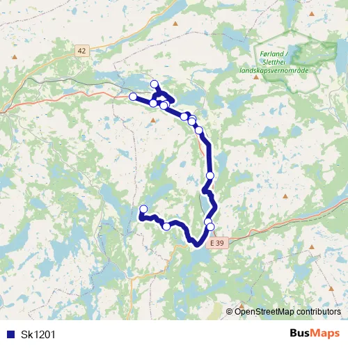 The first stop of the Sk1201 bus route is Heskestad skule and the last stop is Røyselandveien 198. Sk1201 is operational during på hverdager.
