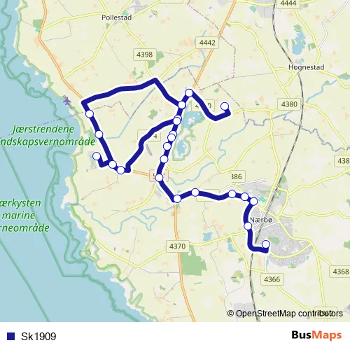 The first stop of the Sk1909 bus route is Rimestad and the last stop is